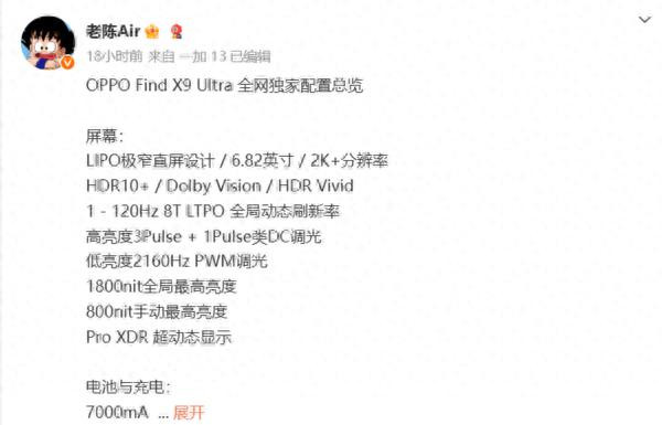 据数码博主最新发布的信息显示,与此前曝光的消息基本一致,全新的OPPO Find X9 Ultra将采用一块6.82英寸的2K+分辨率LTPO极窄直屏,支持1-120Hz 8T LTPO全局动态刷新率,全局最高亮度可达1800nit,手动最高亮度为800nit,提供HDR10+、Dolby Vision和HDR Vivid等多种显示技术,支持Pro XDR超动态显示。同时,该机还可能采用高亮度3Pulse+1Pulse类DC调光和低亮度2160Hz PWM调光技术。