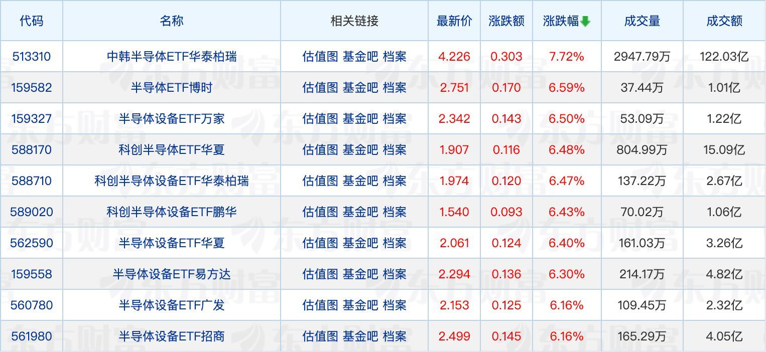 ETF涨跌幅方面,半导体相关ETF涨超6%。